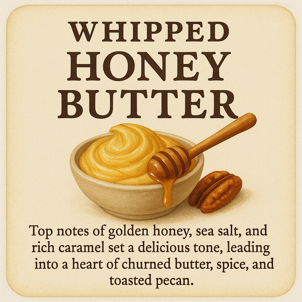 Indulge in the luxurious taste of our Whipped Honey Butter, a perfect blend of creamy butter and golden honey. With top notes of golden honey, sea salt, and rich caramel, this delicious spread transforms into a heart of churned butter, warm spice, and toasted pecan.